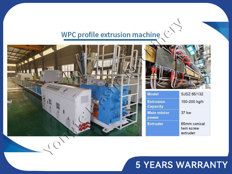 ستتم معالجة حبيبات WPC بواسطة بثق المسمار المزدوج المخروطي الذي تم تصميمه خصيصًا لصنع منتجات WPC ، وسيقوم البثق بذوبان مادة WPC مرة أخرى ومعالجة المادة في قالب ملف تعريف WPC لتشكيل الحجم والشكل المطلوب ، ويجهز هذا الخط أيضًا بجهاز التبريد وجهاز القطع.