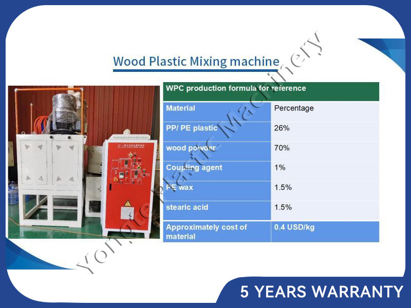 يجب خلط مسحوق الخشب والرقائق البلاستيكية مع إضافات كيميائية. تبلغ نسبة الخلط حوالي 70 ٪ من الألياف الخشبية مع 26 ٪ من البلاستيك ، وسنوفر صيغة للعميل تمامًا وفقًا لموادهم.